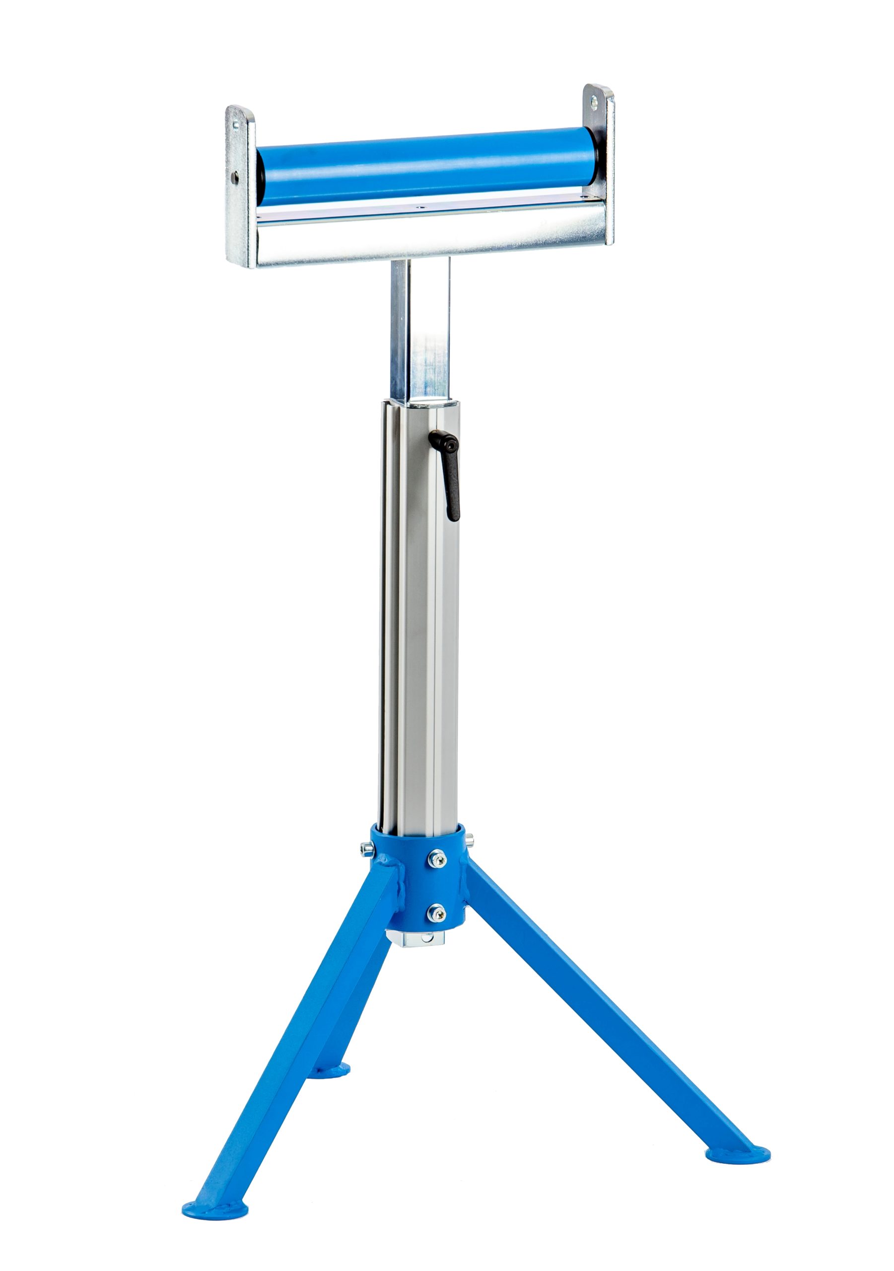 Höhenverstellbarer Materialständer mit Kunststoff-Tragrolle, Klemmsystem und Dreibein-Untergestell – Ideal auch für den mobilen Einsatz – Made in Germany