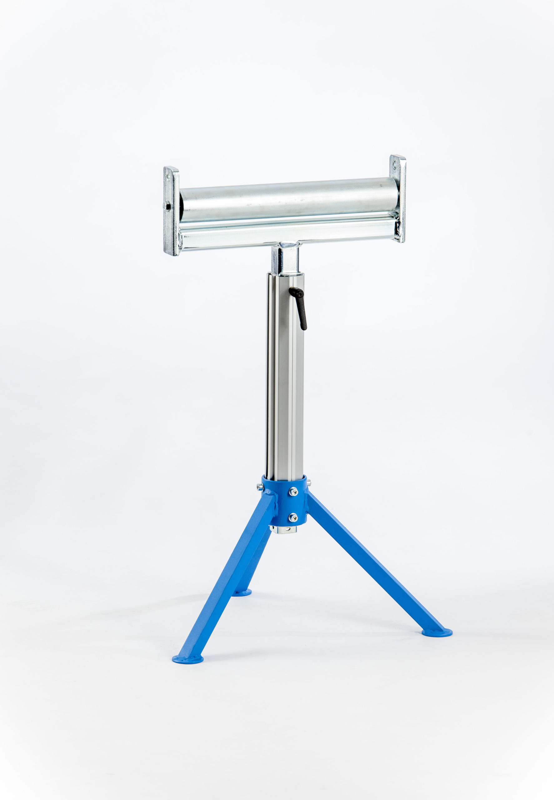 höhenverstellbarer Materialständer mit Stahl-Tragrolle, Klemmsystem und Dreibein-Untergestell – Ideal auch für den mobilen Einsatz – Made in Germany