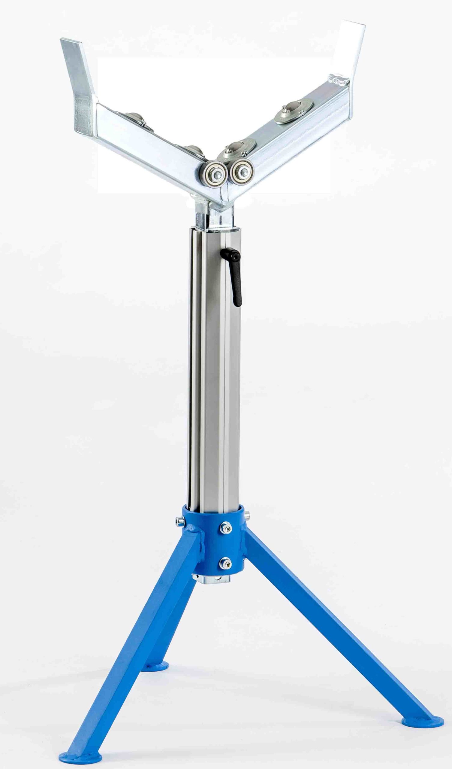 höhenverstellbarer Materialständer mit V-Gabel und Kugelrollen für Rundmaterial, Klemmsystem und Dreibein-Untergestell – Ideal auch für den mobilen Einsatz – Made in Germany